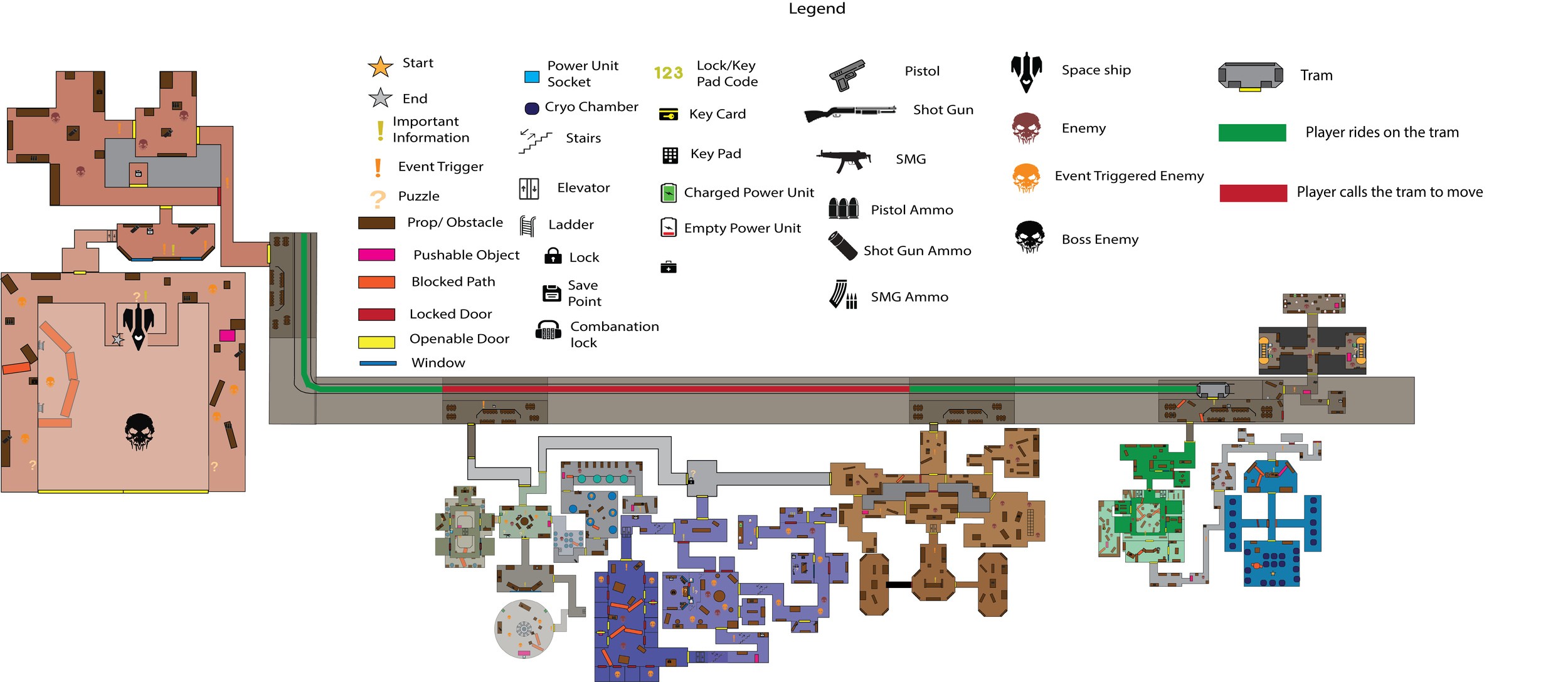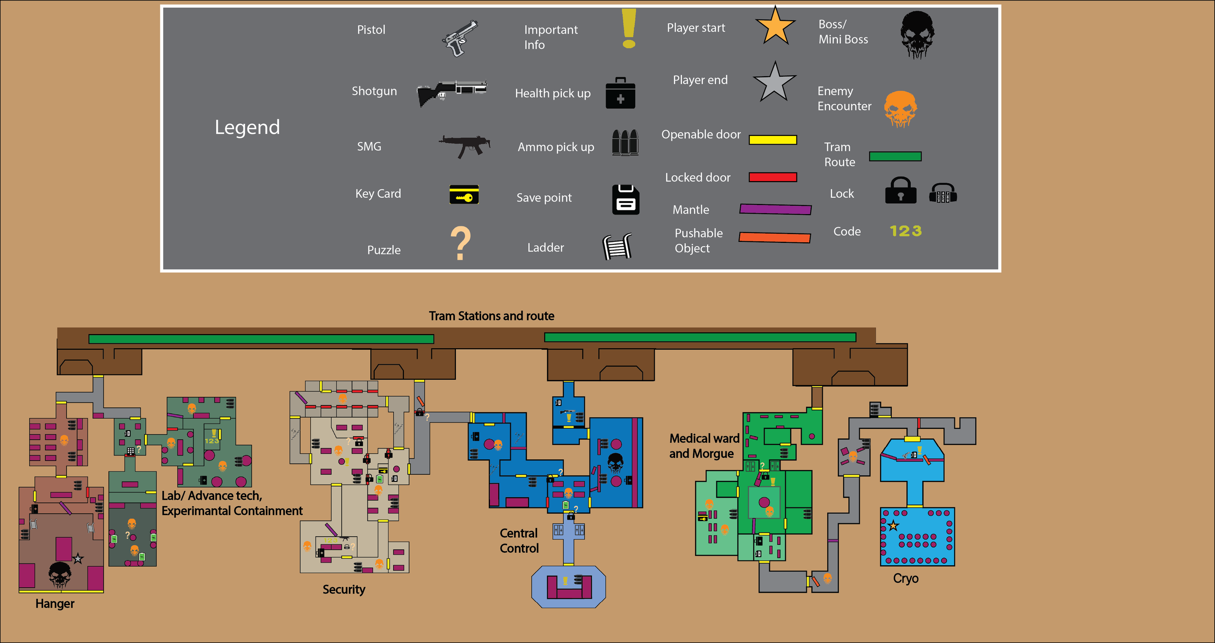 My next step was to hop into illustrator and start creating a 2d map of what I wanted the map for my level to look like. This is the original map that changed drastically as I created the level in engine. After running through different setting ideas of how I want the layout and flow of each area to connect from one to another and the tram route through the station I ended up deciding on this as my initial 2d map and lay out. While I concluded on this as a start I was thinking of “wow” and “scare” moments and how the player will use not just traditional combat but also environmental through the telekinesis system I made in each space.